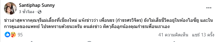 ล่าสุด เฟซบุ๊กที่ชื่อว่า ไพโรจน์ สุดใจทวีผล โดยมีการรีโพสต์ข้อความจากเฟซบุ๊ก Santiphap Sunny เล่าว่า ข่าวล่าสุดจากคุณจุรีแม่เลี้ยงที่เชียงใหม่ แจ้งข่าวว่า เพื่อนธร (กำธร ศรวิจิตร) ยังไม่เสียชีวิตอยู่ในห้องไอซียู และในการดูแลของแพทย์ โปรดทราบด้วยนะครับ คนส่งข่าวผิดๆ คือลูกน้องคุณกำธรเพื่อนเราเอง