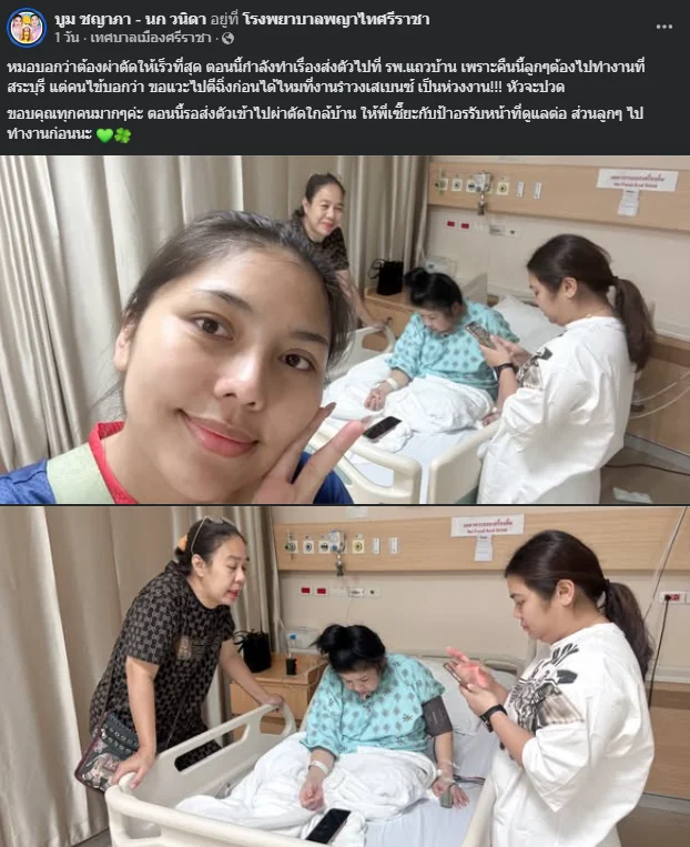 ขอบคุณทุกคนมาก ๆ ค่ะ ตอนนี้รอส่งตัวเข้าไปผ่าตัดใกล้บ้าน ให้พี่เซี๊ยะกับป้าอรรับหน้าที่ดูแลต่อ ส่วนลูก ๆ ไปทำงานก่อนนะ