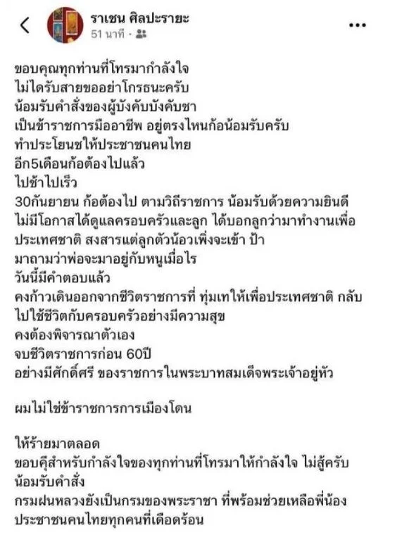 ล่าสุด ด้าน นายราเชน ได้ออกมาโพสต์ข้อความผ่านบัญชีเฟซบุ๊กส่วนตัว โดยระบุว่า ขอบคุณทุกท่านที่โทรมากำลังใจ ไม่ได้รับสายขออย่าโกรธนะครับ น้อมรับคำสั่งของผู้บังคับบัญชา เป็นข้าราชการมืออาชีพ อยู่ตรงไหนก็น้อมรับครับ ทำประโยชน์ให้ประชาชนคนไทย อีก 5 เดือนก็ต้องไปแล้ว ไปช้าไปเร็ว 30 กันยายน ก็ต้องไป ตามวิถีราชการ น้อมรับด้วยความยินดี ไม่มีโอกาสได้ดูแลครอบครัวและลูก ได้บอกลูกว่ามาทำงานเพื่อประเทศชาติ สงสารแต่ลูก ตัวน้องเพิ่งจะเข้า ป้ามาถามว่าพ่อจะมาอยู่กับหนูเมื่อไร