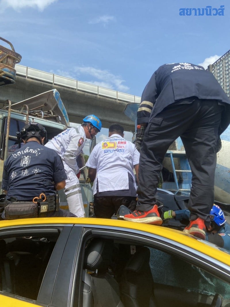 ตรวจสอบข้างประตูรถเก๋งฝั่งซ้าย พบร่าง นายทศพล ฤกษ์เฉลิมพจน์ อายุ 55 ปี เสียชีวิตในสภาพน่าสยดสยอง ศีรษะถูกอัดติดกับขอบประตูรถจนเละ นอกจากนี้ยังมีผู้บาดเจ็บติดภายในรถเก๋งอีก 2 ราย และผู้บาดเจ็บจากรถแท็กซี่ที่ถูกเฉี่ยวชนจนหมุนไปฟาดแบริเออร์อีก 2 ราย เจ้าหน้าที่ต้องระดมเครื่องตัดถ่างเร่งช่วยชีวิตก่อนนำส่งโรงพยาบาลบางปะกอก 9 อินเตอร์เนชั่นแนล และ รพ.ศิริราช