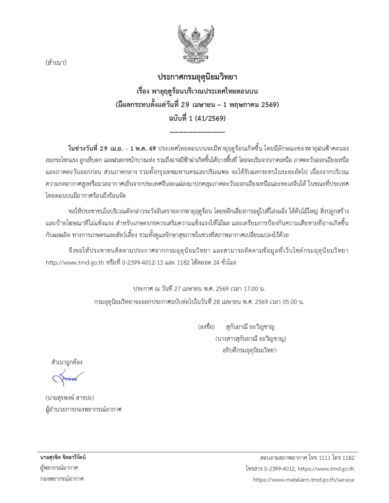 ประชาชนสามารถติดตามประกาศเพิ่มเติมจากกรมอุตุนิยมวิทยาได้ตลอด 24 ชั่วโมง โดยจะมีการออกประกาศฉบับถัดไปในวันที่ 28 เมษายน 2569 เวลา 05.00 น.