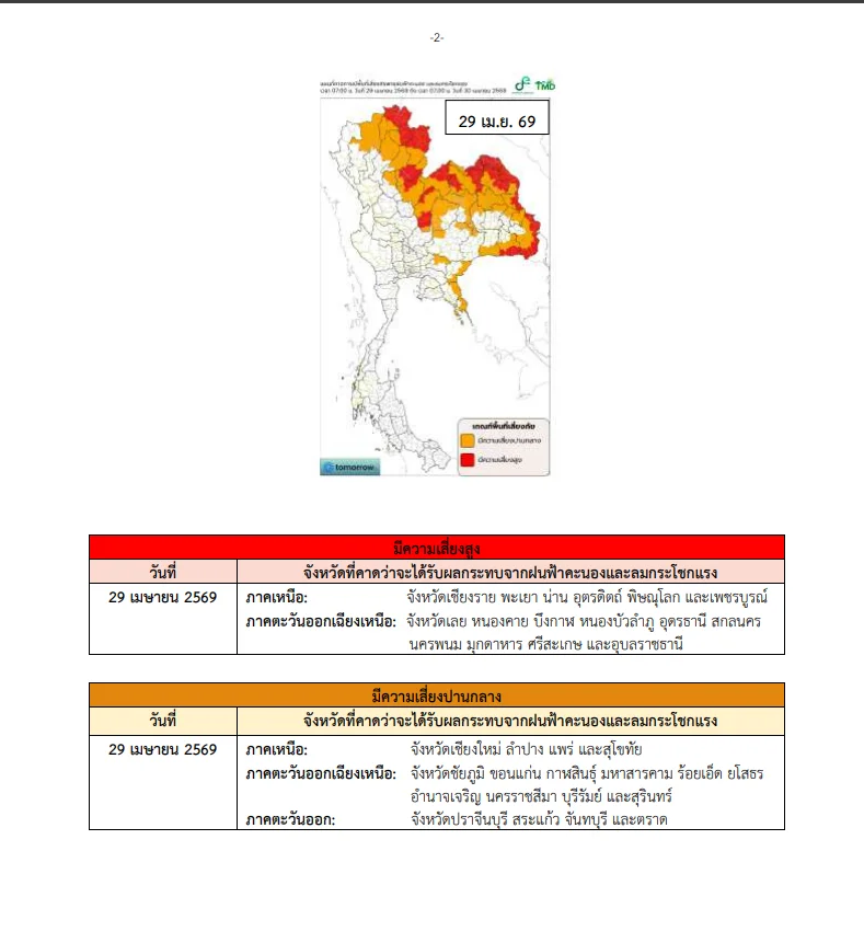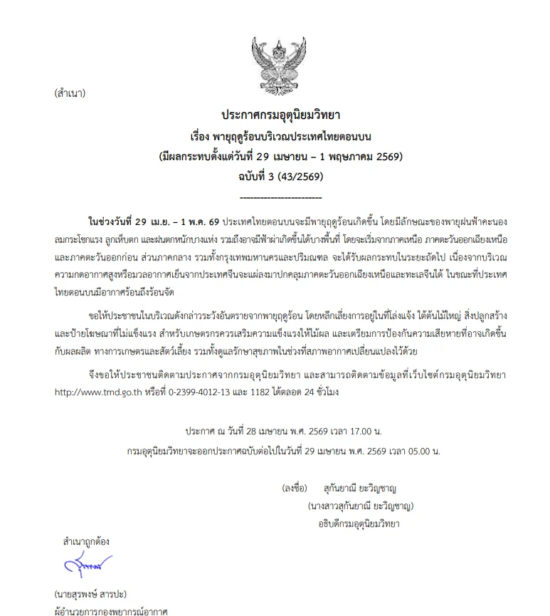 วันที่ 28 เมษายน 2569 กรมอุตุนิยมวิทยา ออกประกาศฉบับที่ 3 (43/2569) เตือนพายุฤดูร้อนถล่มประเทศไทยตอนบน มีผลกระทบช่วงวันที่ 29 เมษายน - 1 พฤษภาคม 2569