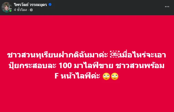 โดย แพรรี่ ไพรวัลย์ วรรณบุตร ได้โพสต์ผ่านเฟซบุ๊กสะท้อนเสียงจากชาวสวน ระบุว่า ชาวสวนทุเรียนฝากดิฉันมาค่ะ เมื่อไหร่จะเอาปุ๋ยกระสอบละ 100 มาไลฟ์ขาย ชาวสวนพร้อม F หน้าไลฟ์ค่ะ