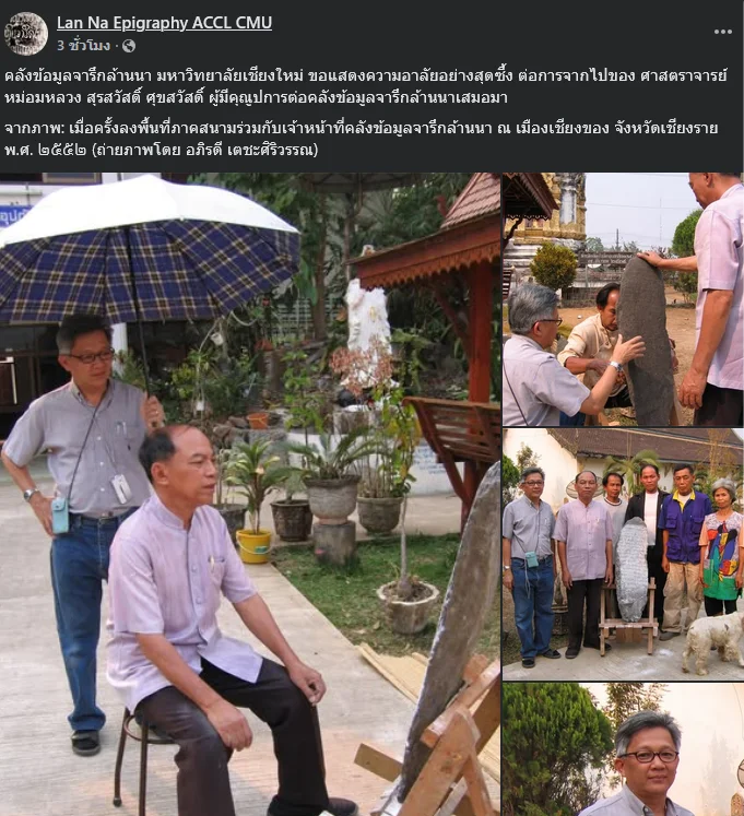 ขณะเดียวกัน เพจ Lan Na Epigraphy ACCL CMU ได้โพสต์ภาพพร้อมข้อความแสดงความอาลัยเช่นกัน โดยระบุว่า