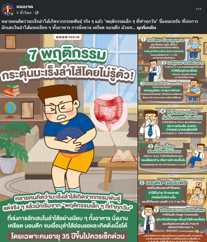 นพ.เจษฎ์ บุณยวงศ์วิโรจน์ รองผู้อำนวยการกิจการด้านปฐมภูมิ โรงพยาบาลมหาราชนครราชสีมา โพสต์เฟซบุ๊ก หมอเจด ให้ความรู้เกี่ยวกับ 7 พฤติกรรมเล็ก ๆ เสียงเป็น มะเร็งลำไส้ได้