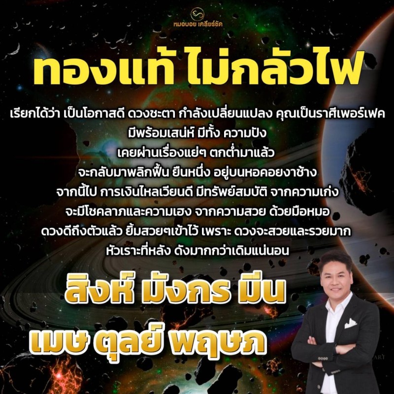 เพจเฟซบุ๊ก หมอบอย เคลียร์ชัด เผยถึงดวงชะตา 6 ราศี ทองแท้ ไม่กลัวไฟ เรียกได้ว่าเป็นโอกาสดี ดวงชะตา กำลังเปลี่ยนแปลง คุณเป็นราศีเพอร์เฟค มีพร้อมเสน่ห์ มีทั้งความปัง เคยผ่านเรื่องแย่ ๆ ตกต่ำมาแล้ว จะกลับมาพลิกฟื้น ยืนหนึ่ง อยู่บนหอคอยงาช้าง