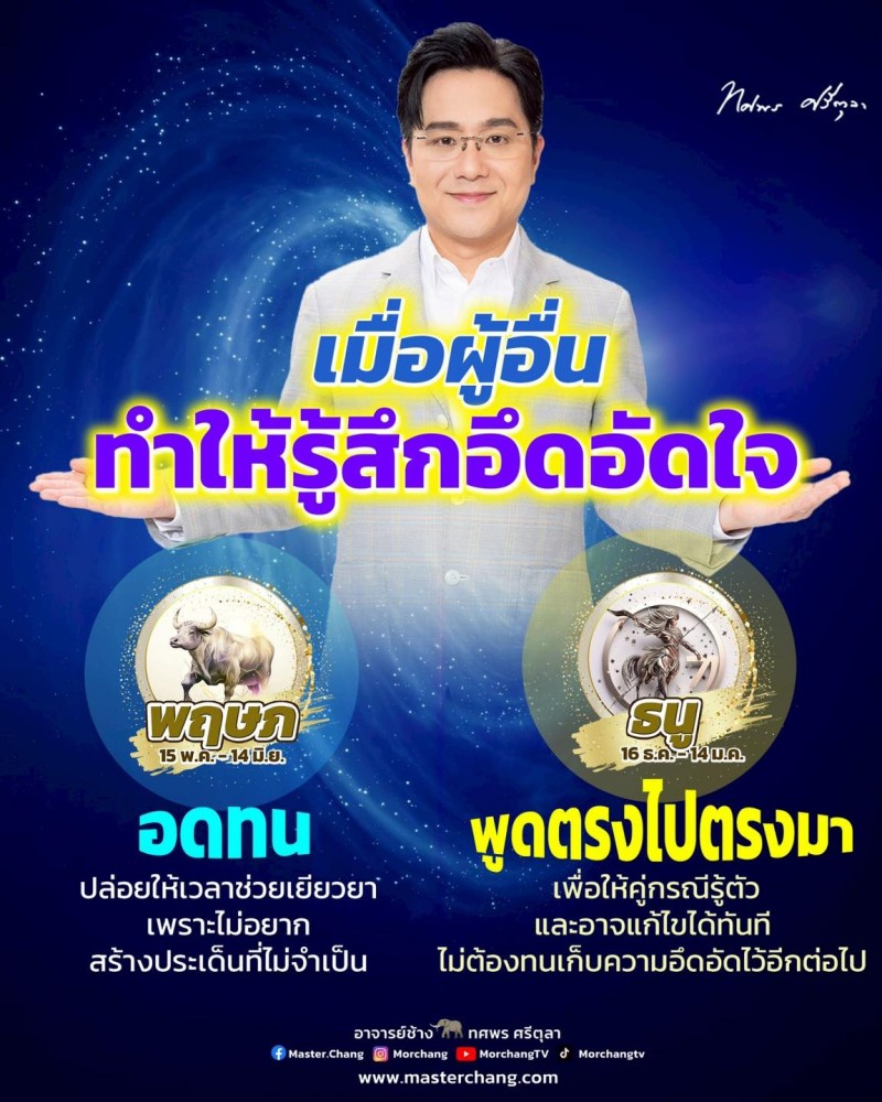 เพจเฟซบุ๊ก หมอช้าง ทศพร ศรีตุลา หรือที่รู้จักกันดีในนามหมอช้าง หมอดูชื่อดังเมืองไทย ได้โพสต์คำทำนายดวงชะตาเกี่ยวกับความอึดอัดใจของคน 2 ราศี พร้อมแนะนำวิธีจัดการเพื่อความสบายใจในชีวิตประจำวัน