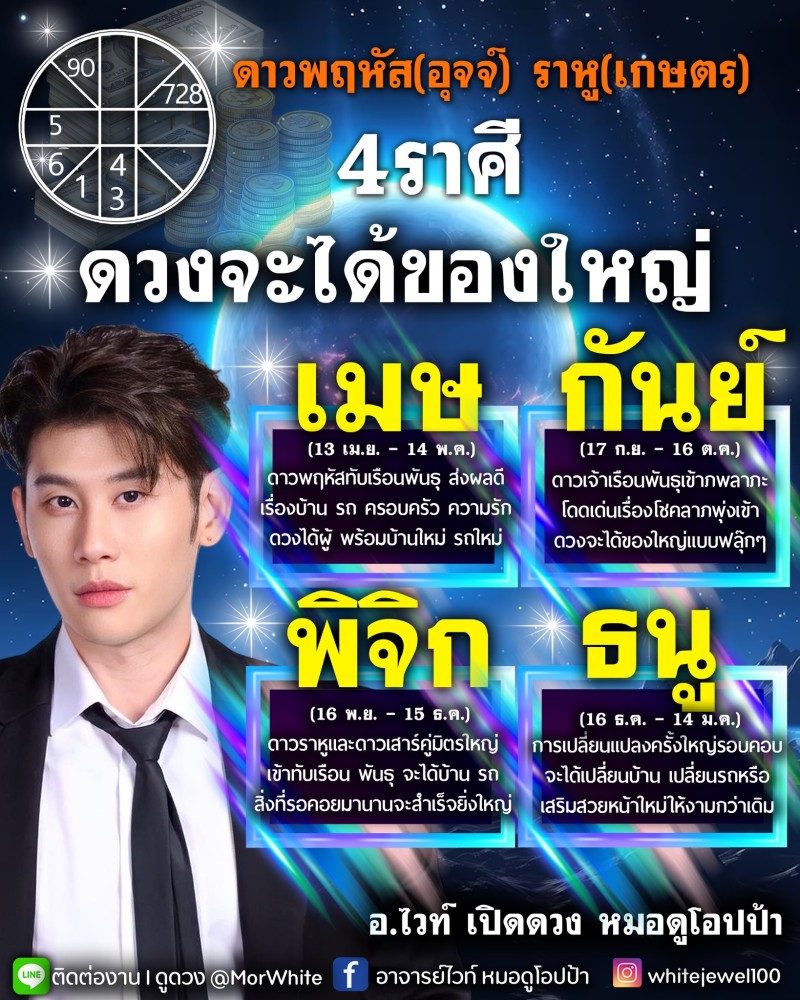 เพจเฟซบุ๊ก อาจารย์ไวท์ หมอดูโอปป้า ได้โพสต์คำทำนาย ทายทักถึงดวงชะตา 4 ราศี ดาวพฤหัส (อุจจ์) ราหู (เกษตร) มีดวงจะได้ของใหญ่ โดย 4 ราศี ดังกล่าว ได้เเก่ ราศีเมษ ราศีกันย์ ราศีพิจิก และราศีธนู