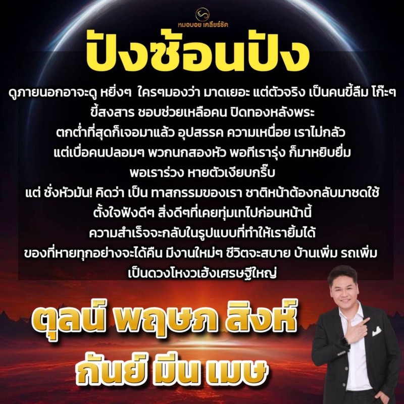 เพจเฟซบุ๊ก หมอบอย เคลียร์ชัด เผยถึงดวงชะตา 6 ราศี ปังซ้อนปัง ดูภายนอกอาจะดู หยิ่ง ๆ ใคร ๆมองว่า มาดเยอะ แต่ตัวจริง เป็นคนขี้ลืม โก๊ะ ๆ ขี้สงสาร ชอบช่วยเหลือคน ปิดทองหลังพระ ตกต่ำที่สุดก็เจอมาแล้ว อุปสรรค ความเหนื่อย เราไม่กลัว แต่เบื่อคนปลอม ๆ พวกนกสองหัว พอทีเรารุ่ง ก็มาหยิบยื่น พอเราร่วง หายตัวเงียบกริ๊บ