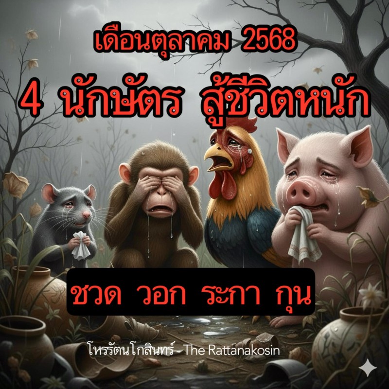 เมื่อมีการเปลี่ยนแปลงเดือน กาลเวลาผันเปลี่ยน ดวงชะตาก็ต้องมีการเปลี่ยนแปลงตามไปด้วย นั่นจึงทำให้ โหรรัตนโกสินทร์ - The rattanakosin ได้ออกมาทำนายดวงชะตาชาวนักษัตร ระบุว่า 4 นักษัตร สู้ชีวิตหนัก เดือนตุลาคม 2568 ชวด วอก ระกา กุน การงานมีอุปสรรค ระวังสุขภาพและอุบัติเหตุ ไหว้เจ้าที่เจ้าทางเป็นประจำจะปลอดภัย #โหรรัตนโกสินทร์