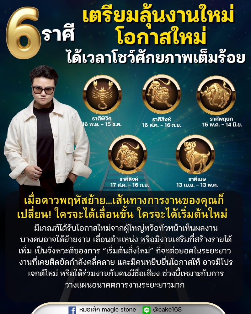 เพจเฟซบุ๊ก หมอเค้ก Magicstone หมอดูและนักพยากรณ์ชื่อดัง ได้ออกมาโพสต์ข้อความเปิดคำทำนายถึงดวงชะตา 5 ราศี เตรียมลุ้นงานใหม่ โอกาสใหม่ ได้เวลาโชว์ศักยภาพเต็มร้อย เมื่อดาวพฤหัสย้าย เส้นทางการงานของคุณก็ เปลี่ยน ใครจะได้เลื่อนขั้น ใครจะได้เริ่มต้นใหม่ มีเกณฑ์ได้รับโอกาสใหม่จากผู้ใหญ่หรือหัวหน้าเห็นผลงาน
