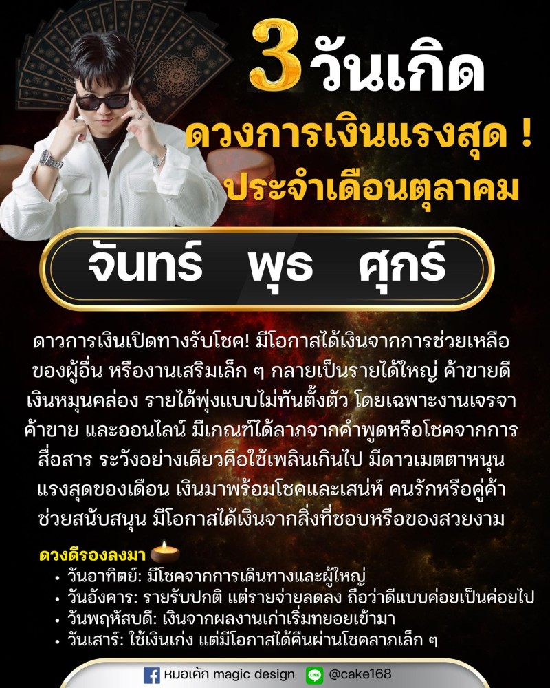เพจเฟซบุ๊ก หมอเค้ก Magicstone หมอดูและนักพยากรณ์ชื่อดัง ได้ออกมาโพสต์ข้อความเปิดคำทำนายถึงดวงชะตา 3 วันเกิด ดวงการเงินแรงสุด ประจำเดือนตุลาคม ดาวการเงินเปิดทางรับโชค มีโอกาสได้เงินจากการช่วยเหลือของผู้อื่น หรืองานเสริมเล็ก ๆ กลายเป็นรายได้ใหญ่ ค้าขายดี เงินหมุนคล่อง รายได้พุ่งแบบไม่ทันตั้งตัว โดยเฉพาะงานเจรจาค้ายาย และออนไลน์