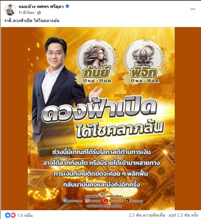 (16 ต.ค. 2568) ใกล้เข้ามาแล้วสำหรับคอหวยที่ต่างเฝ้ารอการออกสลากกินแบ่งรัฐบาล งวดวันที่ 16 ตุลาคม 2568 ล่าสุดเมื่อคืนที่ผ่านมา หมอช้าง-ทศพร ศรีตุลา โพสต์เผยข่าวดีเกี่ยวกับดวงชะตาของ 2 ราศี ที่กำลังจะมีโชคลาภอย่างเห็นได้ชัด