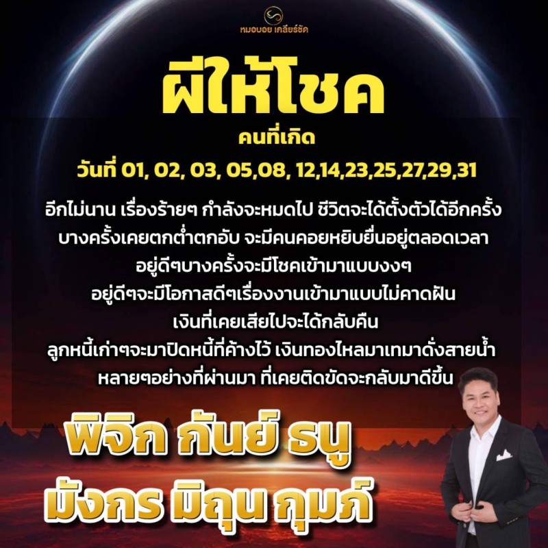 เพจเฟซบุ๊ก หมอบอย เคลียร์ชัด เผยถึงดวงชะตา 6 ราศีผีให้โชค อีกไม่นาน เรื่องร้าย ๆ กำลังจะหมดไป ชีวิตจะได้ตั้งตัวได้อีกครั้ง บางครั้งเคยตกต่ำตกอับ จะมีคนคอยหยิบยื่นอยู่ตลอดเวลา