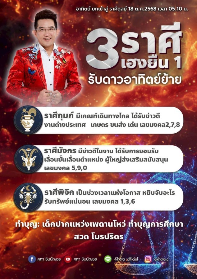 อาจารย์คฑา ชินบัญชร ได้ออกมาโพสต์เปิดคำทำนายผ่านเพจเฟซบุ๊ก คฑา ชินบัญชร ระบุว่า ดาวอาทิตย์จะยกเข้าสู่ราศีตุลย์ในส่งผลให้ 3 ราศีต่อไปนี้ดวงดีเฮงยืนหนึ่ง ได้รับโชคลาภแบบจัดเต็ม