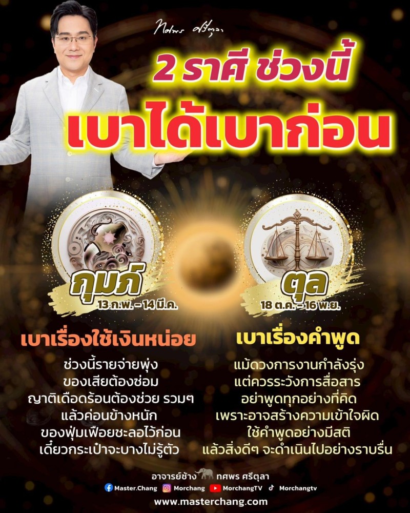 เพจเฟซบุ๊ก หมอช้าง ทศพร ศรีตุลา ระบุว่า 2 ราศี ช่วงนี้ เบาได้เบาก่อน ได้แก่