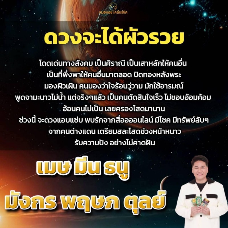 เพจเฟซบุ๊ก หมอบอย เคลียร์ชัด เผยดวงชะตาสุดปังของ 6 ราศี ที่ช่วงนี้มีเกณฑ์จะได้ผัวรวย ดวงโดดเด่นทางสังคม มีภาวะผู้นำ เป็นศิราณี และเสาหลักให้คนอื่นอยู่เสมอ อีกทั้งยังเป็นที่พึ่งพาของคนรอบข้าง ทำดีเงียบ ๆ แบบปิดทองหลังพระไม่หวังผลตอบแทน