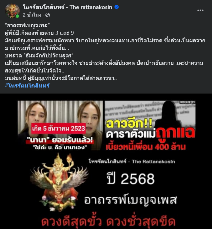 วันที่ 22 พฤศจิกายน 2568 เพจเฟซบุ๊ก โหรรัตนโกสินทร์ - The rattanakosin ได้โพสต์คำทำนายระบุว่า อาถรรพ์เบญจเพส ผู้ที่มีปีเกิดลงท้ายด้วย 3 และ 9 มักเผชิญเคราะห์กรรมหนักหนา วิบากใหญ่หลวงจนแทบเอาชีวิตไม่รอด ซึ่งล้วนเป็นผลจากบาปกรรมที่เคยก่อไว้ทั้งสิ้น