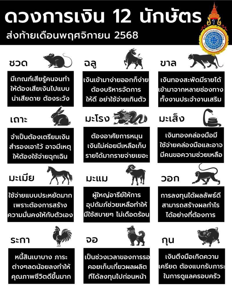 หลังจากที่ผ่านๆ มา มีการนำเสนอดวงชะตาชาวราศีกันไปมากมาย วันนี้เรามีดวงชะตาของชาวนักษัตรมาฝากกันบ้าง เมื่อ เพจเฟซบุ๊ก สมาคมโหรแห่งประเทศไทย ในพระบรมราชินูปถัมภ์ ได้ออกมาโพสต์คำพยากรณ์ 12 นักษัตร ระบุข้อความว่า เช็กดวงการเงิน 12 นักษัตร...ส่งท้ายเดือนพฤศจิกายน 2568 พบว่ามีอยู่ 4 นักษัตร ที่ดวงการเงินไม่ดีเอาซะเลย ต้องระวังเป็นอย่างมาก ประกอบไปด้วย