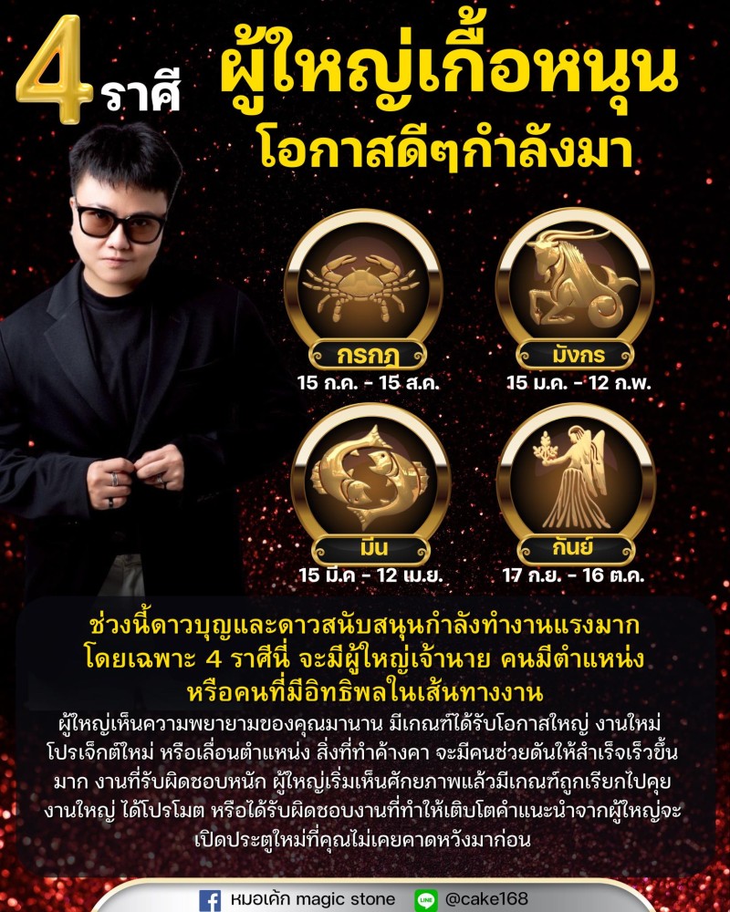 เพจเฟซบุ๊ก หมอเค้ก Magicstone หมอดูและนักพยากรณ์ชื่อดัง ได้ออกมาโพสต์ข้อความเปิดคำทำนายถึงดวงชะตา 4 ราศี ผู้ใหญ่เกื้อหนุน โอกาสดี ๆ กำลังมา ช่วงนี้ดาวบุญและดาวสนับสนุนกำลังทำงานแรงมาก โดยเฉพาะ 4 ราศีนี่้จะมีผู้ใหญ่เจ้านาย คนมีตำแหน่ง หรือคนที่มีอิทธิพลในเส้นทางงาน