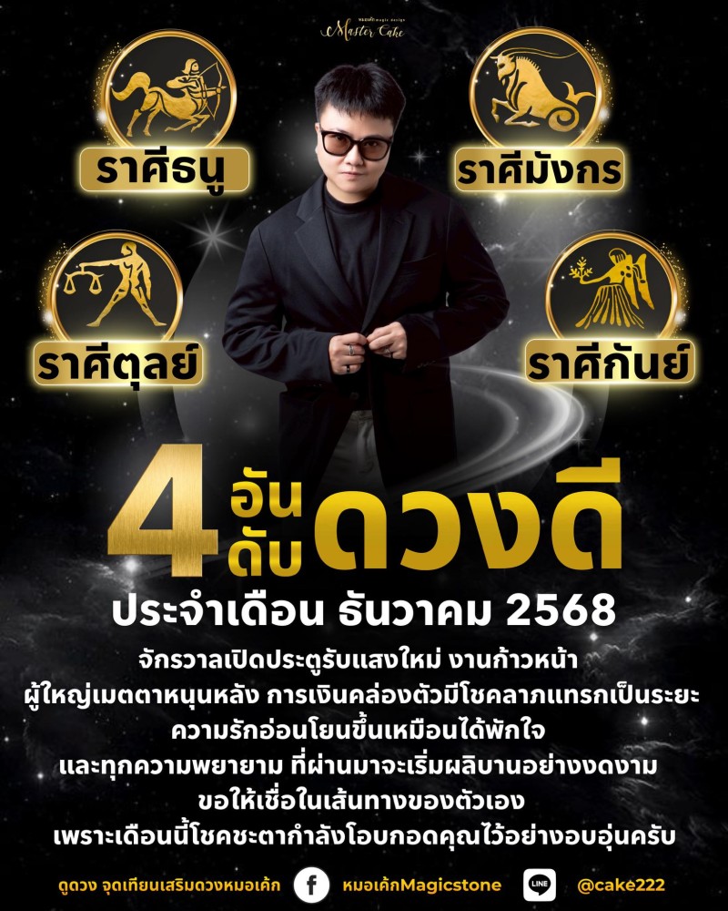 หมอเค้ก หมอดูชื่อดัง ได้โพสต์คำทำนายทายทักผ่านเพจ หมอเค้กดลบันดาล ระบุว่า 4 ราศี คือราศีที่พลังดีไหลเข้ามาในเดือนธันวาคม 2568 ราวกับจักรวาลเปิดประตูรับแสงใหม่ งานก้าวหน้า ผู้ใหญ่เมตตาหนุนหลัง การเงินคล่องตัวมีโชคลาภแทรกเป็นระยะ ความรักอ่อนโยนขึ้นเหมือนได้พักใจ และทุกความพยายามที่ผ่านมาจะเริ่มผลิบานอย่างงดงาม ขอให้เชื่อในเส้นทางของตัวเอง เพราะเดือนนี้โชคชะตากำลังโอบกอดคุณไว้อย่างอบอุ่นครับ