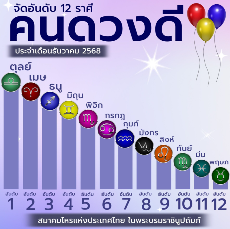 เข้าสู่เดือนธันวาคม 2568 อย่างเป็นทางการ ซึ่งเป็นช่วงเวลาแห่งการสิ้นปีที่หลายคนต่างเฝ้ารอการเปลี่ยนแปลงของดวงชะตา เพื่อเตรียมรับมือกับทั้งข่าวดีและความท้าทายที่อาจเกิดขึ้นในช่วงโค้งสุดท้ายของปีนี้ ล่าสุด! เมื่อวันที่ 5 ธันวาคม 2568 สมาคมโหรแห่งประเทศไทย ในพระบรมราชินูปถัมภ์ ได้ออกมาเปิดเผยผลการจัดอันดับ คนดวงดี ประจำเดือนธันวาคม 2568 ทั้ง 12 ราศี โดยแบ่งกลุ่มตามระดับความโดดเด่นของดวงชะตา เพื่อให้ทุกคนได้เตรียมพร้อมและวางแผนชีวิตในช่วงส่งท้ายปี ดังนี้