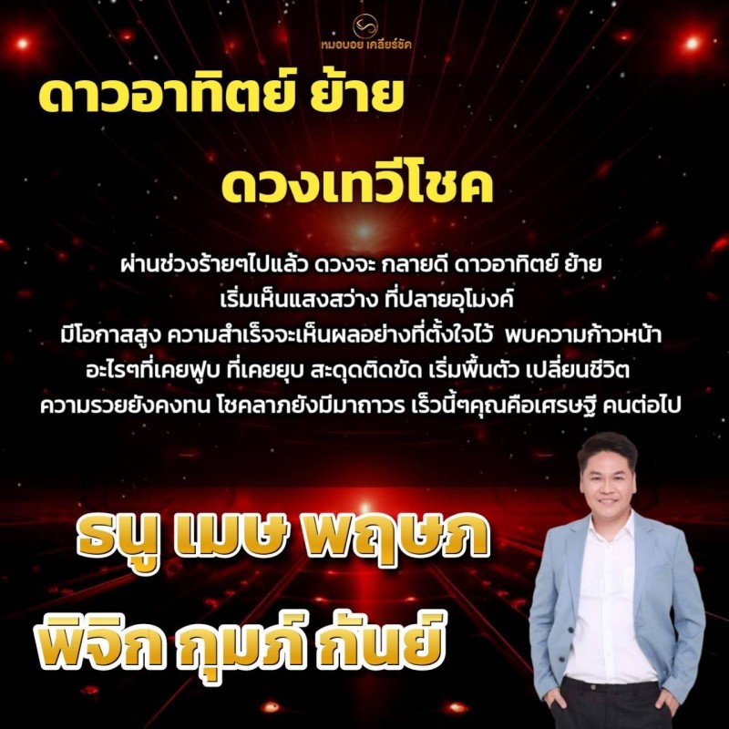 เพจเฟซบุ๊ก หมอบอย เคลียร์ชัด เผยถึงดวงชะตา 6 ราศี ดาวอาทิตย์ย้าย ดวงเทวีโชค ผ่านช่วงร้าย ๆ ไปแล้ว ดวงจะกลายดี ดาวอาทิตย์ย้าย เริ่มเห็นแสงสว่างที่ปลายอุโมงค์ มีโอกาสสูง ความสำเร็จจะเห็นผลอย่างที่ตั้งใจไว้ พบความก้าวหน้า อะไร ๆ ที่เคยฟูบ ที่เคยยุบ สะดุดติดขัด เริ่มพื้นตัว เปลี่ยนชีวิต ความรวยยังคงทน โชคลาภยังมีมาถาวร เร็วนี้ ๆ คุณคือเศรษฐี คนต่อไป