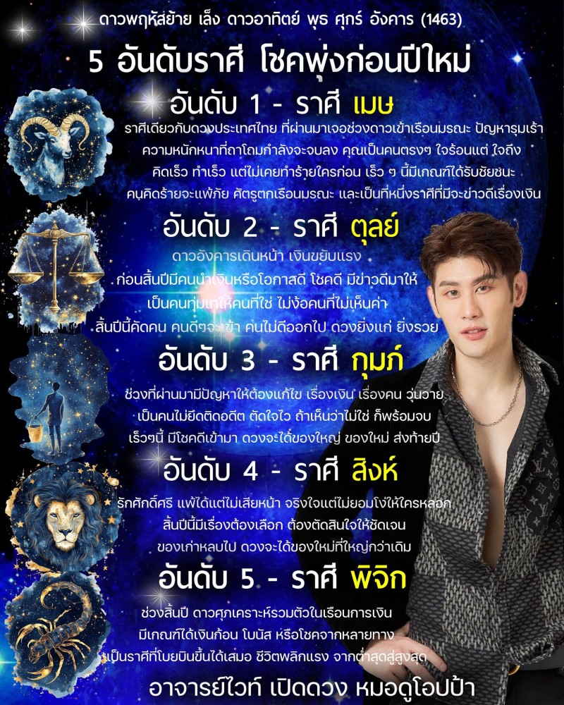 เพจเฟซบุ๊ก อาจารย์ไวท์ หมอดูโอปป้า ได้โพสต์คำทำนาย เปิดดวงชะตา 5 อันดับราศี โชคพุ่งก่อนปีใหม่ หลังดาวพฤหัสย้าย เล็ง ดาวอาทิตย์ พธ ศุกร์ อังคาร