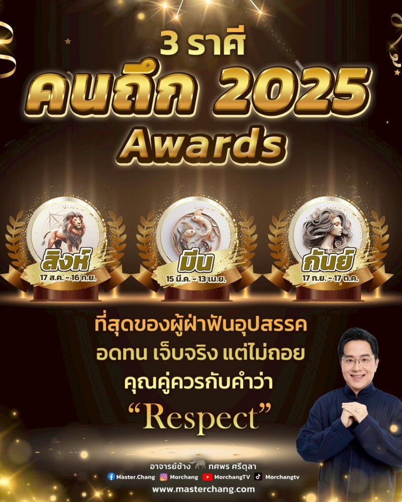 เพจเฟซบุ๊ก หมอช้าง ทศพร ศรีตุลา หรือที่หลายคนรู้จักในนาม หมอช้าง หมอดูชื่อดังเมืองไทย ได้เผยคำทำนาย 3 ราศี คนถึก 2025 Awards