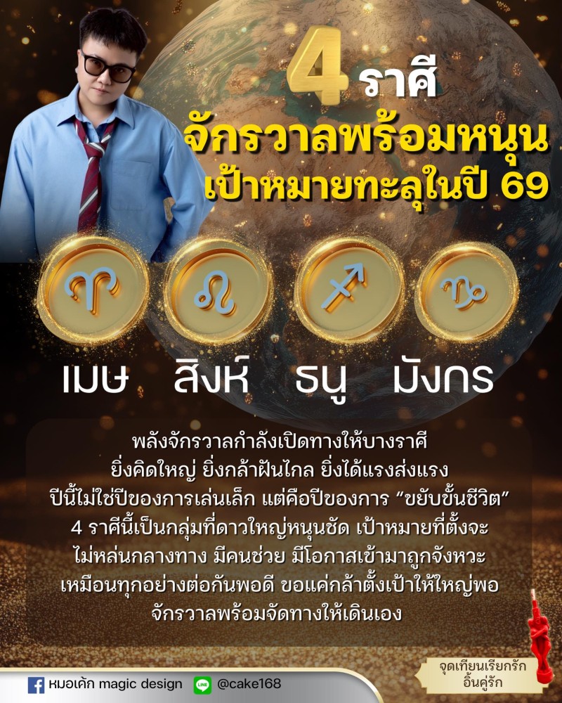 เพจเฟซบุ๊ก หมอเค้ก Magicstone หมอดูและนักพยากรณ์ชื่อดัง ได้ออกมาโพสต์ข้อความเปิดคำทำนายถึง 4 ราศี จักรวาลพร้อมหนุน เป้าหมายทะลุในปี 69