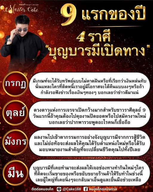 โดยเฉพาะดาวพฤหัสที่ให้ผลเรื่องโอกาส ความก้าวหน้า และการยอมรับ บวกกับดาวเสาร์ที่แรงกดเริ่มอ่อน ทำให้คนที่อดทนมานานเริ่มเห็นผลจริงๆ โดยหมอเค้กระบุว่า 4 ราศีนี้ ไม่ได้เลือกเพราะดวงดีเฉพาะหน้า แต่เป็นราศีที่ บุญเก่ากำลังทำงาน ประกอบด้วย
