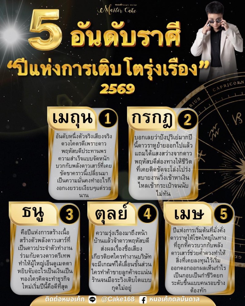 โดยล่าสุด วันที่ 24 มกราคม 2569 ที่ผ่านมา เพจเฟซบุ๊ก หมอเค้กดลบันดาล ได้โพสต์คำทำนายของ 5 อันดับราศี ปี 2569 เป็นปีแห่งการเติบโตของคุณแล้ว