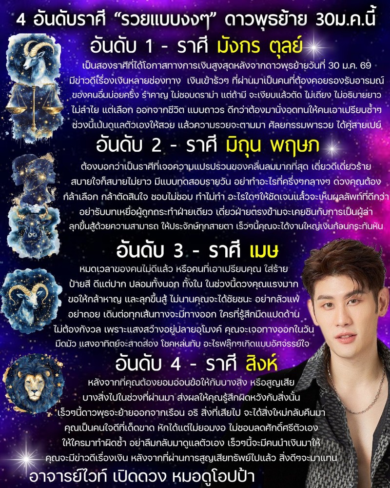 ช่วงนี้ดดวงชะตาของแต่ละราศีมีการเปลี่ยนแปลง โดยอาจเปลี่ยนแปลงทั้งในทางที่ดีและเปลี่ยนแปลงในทางต้องระมัดระวังอาจารย์ไวท์ หมอดูโอปป้า เผยถึง 4 อันดับราศี รวยแบบงงๆ หลังดาวพุธย้าย 30 ม.ค.นี้ โอกาสทางการเงินสูงสุด มีข่าวดีเรื่องเงินหลายช่องทาง เงินเข้ารัวๆ จะได้งานใหญ่เงินก้อนกะทันหัน เร็วๆนี้จะมีคนนำเงินมาให้