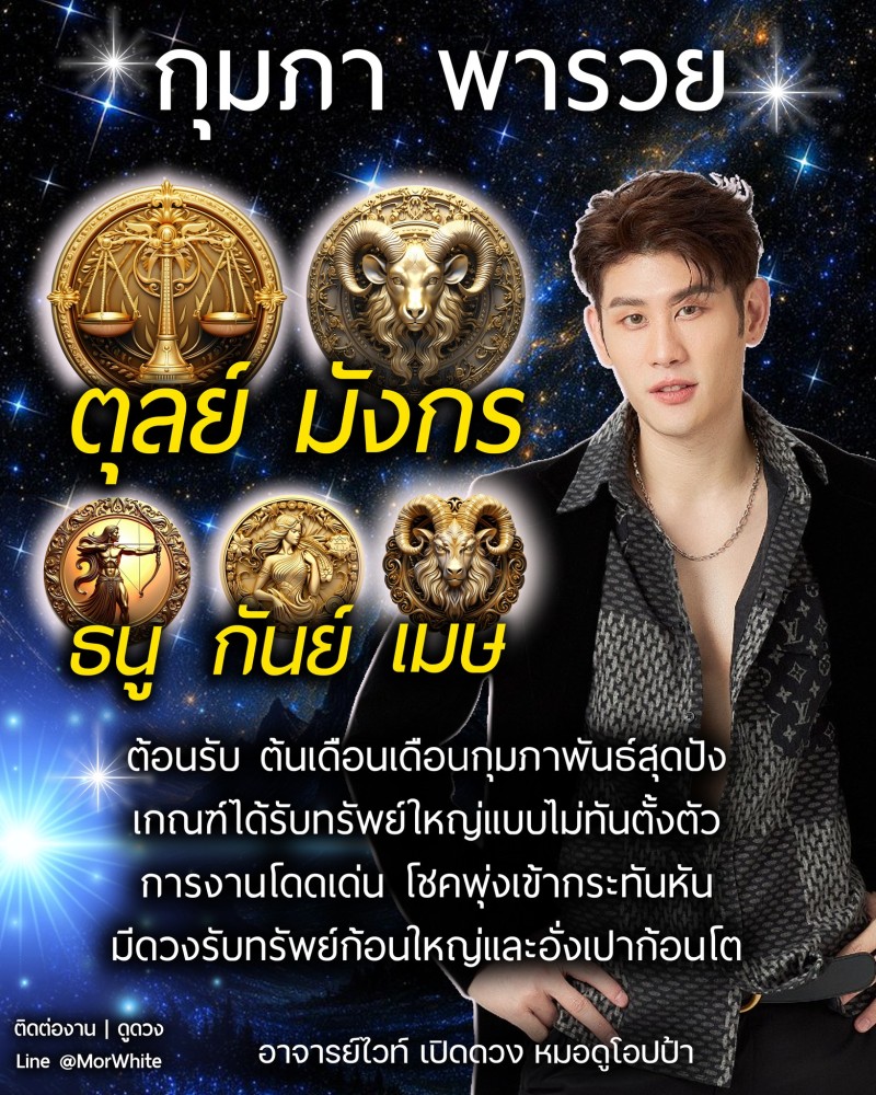 เพจเฟซบุ๊ก อาจารย์ไวท์ หมอดูโอปป้า ได้โพสต์คำทำนาย ทายทักถึงดวงชะตา 5 ราศี กุมภา พารวย ต้อนรับต้นเดือน เดือนกุมภาพันธ์สุดปัง เกณฑ์ได้รับทรัพย์ใหญ่แบบไม่ทันตั้งตัว การงานโดดเด่น โชคพุ่งเข้ากะทันหัน มีดวงรับทรัพย์ก้อนใหญ่ และอั่งเปาก้อนโต จะมีราศีใดบ้างไปดูกัน