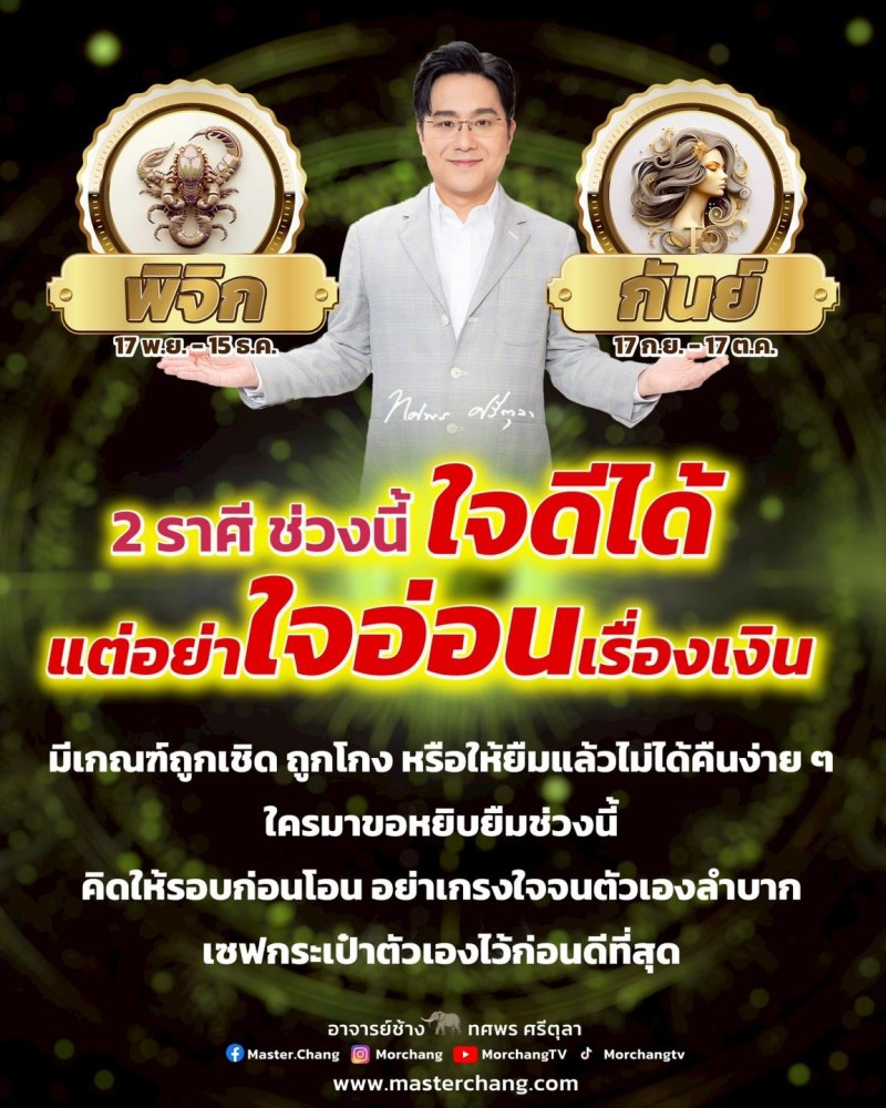 เพจเฟซบุ๊ก หมอช้าง ทศพร ศรีตุลา หรือที่เรารู้จักกันดีในนามหมอช้าง หมอดูชื่อดังเมืองไทย ได้โพสต์คำทำนายถึง 2 ราศี ช่วงนี้ ใจดีได้ แต่อย่าใจอ่อนเรื่องเงิน มีเกณฑ์ถูกเชิด ถูกโกง หรือให้ยืมแล้วไม่ได้คืนง่าย ๆ ใครมาขอหยิบยืมช่วงนี้ คิดให้รอบก่อนโอน อย่าเกรงใจจนตัวเองลำบาก เซฟกระเป๋าตัวเองไว้ก่อนดีที่สุด จะมีราศีใดบ้างนั้นที่ต้องระมัดระวังในเรื่องดังกล่าว ไปดูกัน