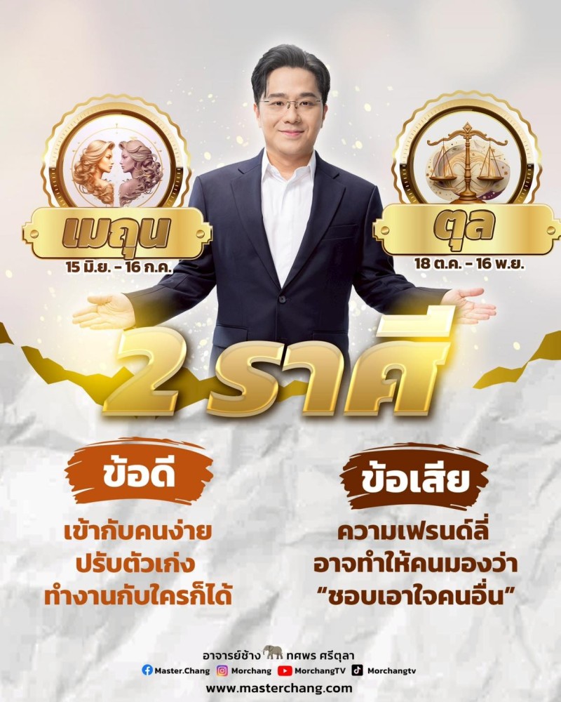 เพจเฟซบุ๊ก หมอช้าง ทศพร ศรีตุลา หรือที่เรารู้จักกันดีในนามหมอช้าง หมอดูชื่อดังเมืองไทย ได้โพสต์คำทำนายถึง 2 ราศี ข้อดี คือ เข้ากับคนง่าย ปรับตัวเก่ง ทำงานกับใครก็ได้ ส่วนข้อเสีย คือ ความเฟรนลี่อาจทำให้คนมองว่า ชอบเอาใจคนอื่น จะมีราศีใดบ้างไปดูกัน