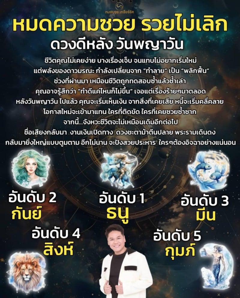 เพจเฟซบุ๊ก หมอบอย เคลียร์ชัด เผยถึงดวงชะตา 5 ราศี หมดความซวย รวยไม่เลิก ดวงดีหลัง วันพญาวัน ชีวิตคุณไม่เคยง่าย บางเรื่องเจ็บ จนแทบไม่อยากเริ่มใหม่ แต่พลังของดาวมรณะ กำลังเปลี่ยนจาก ทำลาย เป็น พลิกฟื้น ช่วงที่ผ่านมา เหมือนชีวิตถูกทดสอบซ้ำแล้วซ้ำเล่า คุณอาจรู้สึกว่า ทำดีแค่ไหนก็ไม่ขึ้น เจอแต่เรื่องร้ายตลอด