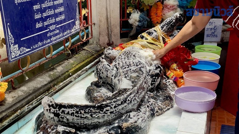 อีกหนึ่งจุดที่สายมูให้ความสนใจ คือการได้มาอาบน้ำทำความสะอาดรูปปั้นจระเข้ ที่หลวงพ่อสนิท ท่านได้สร้างและอธิษฐานจิตปลุกเสกไว้ก่อนมรณภาพ ประดิษฐานอยู่หน้ามณฑป ด้านซ้าย-ขวา มีด้วยกัน 2 ตัว โดยเชื่อกันว่ามีความศักดิ์สิทธิ์ หากใครได้มาทำความสะอาด อาบน้ำให้กับรูปปั้นจระเข้คู่นี้ก็จะมีโชค หรือมีปัญหาทางการเงิน เป็นหนี้ สภาพการเงินฝืด ทำอะไรก็ติดๆ ขัดๆ ก็ให้มาอธิษฐานและทำความสะอาดอาบน้ำรูปปั้นจระเข้คู่นี้ แล้วปัญหาอุปสรรคต่างๆ จะผ่านไปอย่างราบรื่น