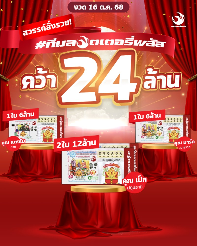 ล่าสุด ลอตเตอรี่พลัส ได้ประกาศผู้โชคดี งวด 16 ต.ค. 68 รางวัลที่ 1 อยู่กับ ลอตเตอรี่พลัส 4 ใบ 24 ล้านบาท!!