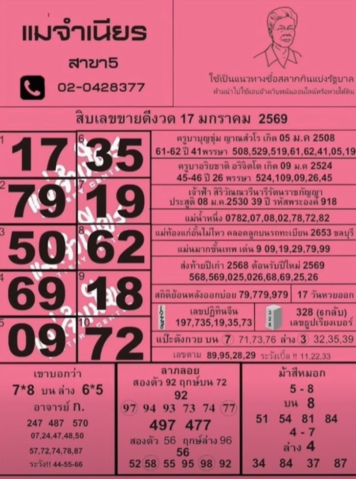 ต้องบอกว่าวันที่ใครหลายคนรอคอยก็ใกล้จะมาถึงแล้ว สำหรับวันออกสลากกินแบ่งรัฐบาล ประจำงวดวันที่ 17 ม.ค. 2569 โดยในงวดนี้ ได้มีหลายสำนักออกมาใบ้เลขดังกันอย่างคึกคัก ใครยังไม่มีเลขในใจต้องรีบไปหาจับจองกันได้แล้ว แต่ถ้ายังไม่มี หรืออยากหาเลขเพิ่มเติม แผงหวยแม่จำเนียร ได้ออกมาประกาศ 10 เลขขายดีประจำงวดนี้ เพื่อเป็นแนวทางให้นักเสี่ยงโชคทั้งหลายนำไปลุ้นรวยงวดนี้กัน