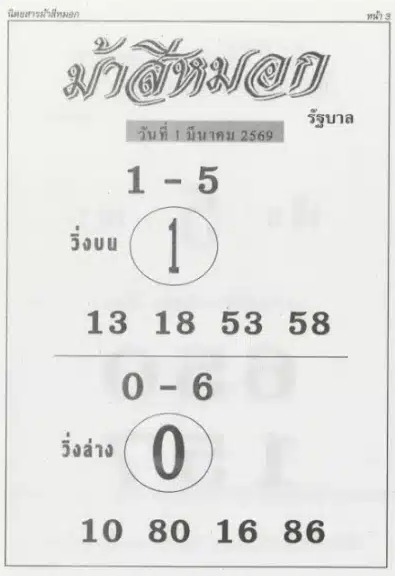 สำหรับงวดประจำวันที่ 1 มีนาคม 2569 แนวทางจากม้าสีหมอก ได้คัดเลือกตัวเลขเด่นออกเป็น 2 ชุดหลัก แบ่งชัดเจนระหว่างแนวทางเลขบนและเลขล่าง เพื่อให้นักเสี่ยงโชคนำไปพิจารณาเป็นแนวทาง ดังนี้
