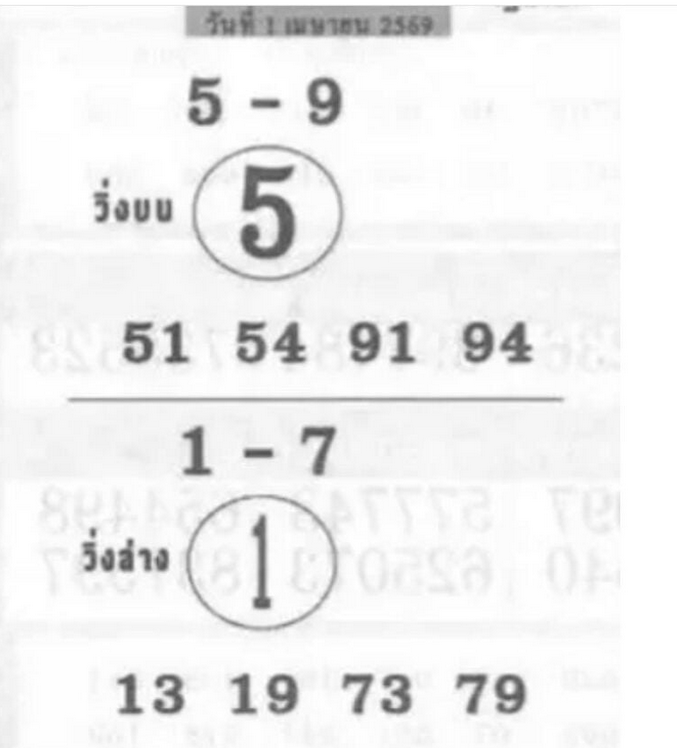ขณะที่ชุดเลข 2 ตัว (ล่าง) ให้ความสำคัญกับเลขเด่น 1 และ 7 พร้อมเน้นเลขวิ่งล่าง 1 โดยมีเลขท้าย 2 ตัวที่เป็นแนวทาง คือ 13 19 73 และ 79