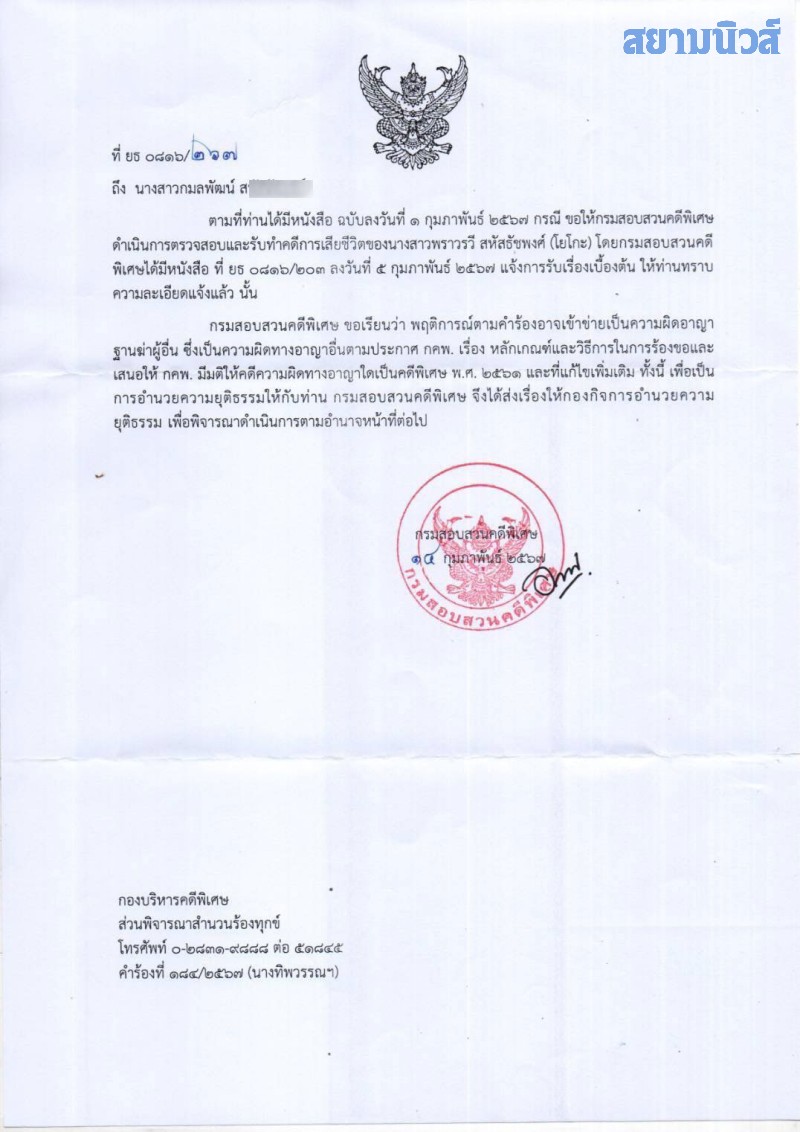 แหล่งข่าวระบุว่า ดีเอสไอ ได้แจ้งต่อ น.ส.กมลพัฒน์ ว่า มีความเป็นไปได้ที่จะพิจารณารับคดีนี้ไว้เป็นคดีพิเศษ ซึ่งจะนำไปสู่การสืบสวนสอบสวนที่เข้มข้นและครอบคลุมมากยิ่งขึ้น เพื่อคลี่คลายปริศนาการเสียชีวิตภายในคอนโดมิเนียมหรูย่านเอกมัย เมื่อวันที่ 1 พฤศจิกายน 2566 ซึ่งญาติยังคงติดใจในสาเหตุและเงื่อนงำที่เกิดขึ้น