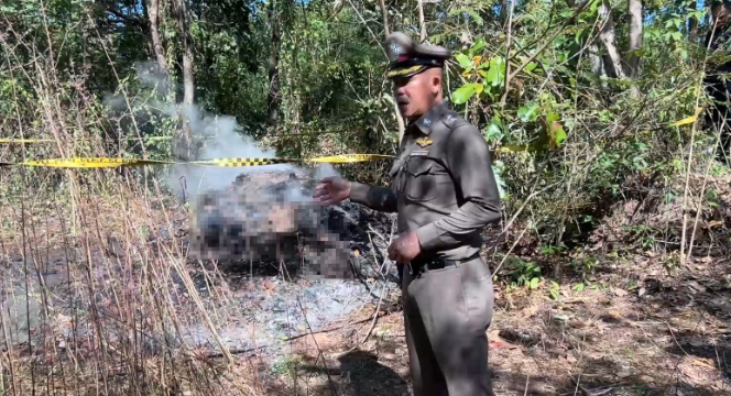 ที่เกิดเหตุอยู่ห่าวจากริมทางลึกเข้าไปประมาณ 50 เมตร เจ้าหน้าที่พบกองดินมีกลุ่มควันไฟ ตรวจสอบพบมีศพปริศนาไม่ทราบเพศ สภาพนอนคว่ำหน้าอยู่ในกองดินขวามือ ถูกเพลิงไหม้เกรียม