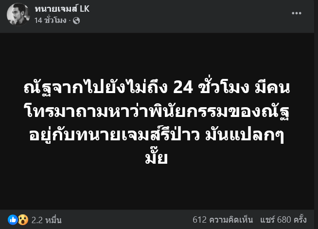 ล่าสุด ทนายเจมส์ ทนายความชื่อดังได้ออกมาเคลื่อนไหวถึงเรื่องนี้ว่า ณัฐจากไปยังไม่ถึง 24 ชั่วโมง มีคนโทรมาถามหาว่าพินัยกรรมของณัฐอยู่กับทนายเจมส์รึป่าว มันแปลกๆ มั๊ย