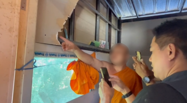 ขณะที่ นายคเณศ ศรีตระกูล ปลัดอำเภอ และ พ.อ.ศักดิ์ศิลป์ กำเนิดสินธุ์ กอ.รมน.จ.ชลบุรี ร่วมกันเปิดเผยว่า เบื้องต้นได้รับการร้องเรียนจากชาวบ้านว่า มีพระในวัดนี้มีอาวุธปืนและมีการเสพยาเสพติด จึงปฏิบัติหน้าที่รวมพลังเข้าตรวจค้น พบว่า มีพระอยู่ 4 รูป ตรวจสอบพระลูกวัดตรวจหาสารเสพติด พบฉี่เป็นสีม่วงทั้ง 3 รูป มีทั้งยาบ้าและยาไอซ์ ส่วนเจ้าสำนักสงฆ์นั้น ก็ตรวจสอบพบมีเงินสดจำนวนมาก และพบเครื่องฉายวีดีโอลามก พร้อมทั้งเครื่องปั๊มอวัยวะเพศ ตรวจสอบชื่อนามสกุลไม่มีในสำนักงานทะเบียนราษฎร์ของประเทศไทย จึงจะมีการจับสึกทั้ง 4 รูป โดยมีการแยกกัน 3 รูปที่เสพยาเสพติดนั้นก็จะส่งให้ตำรวจและเจ้าหน้าที่เกี่ยวข้องนำไปบำบัดรักษาต่อไป ส่วนเจ้าสำนักสงฆ์นั้นก็จะส่งให้ตำรวจไปสอบสวนและส่งตัวให้ ตม.ผลักดันกลับประเทศต่อไป