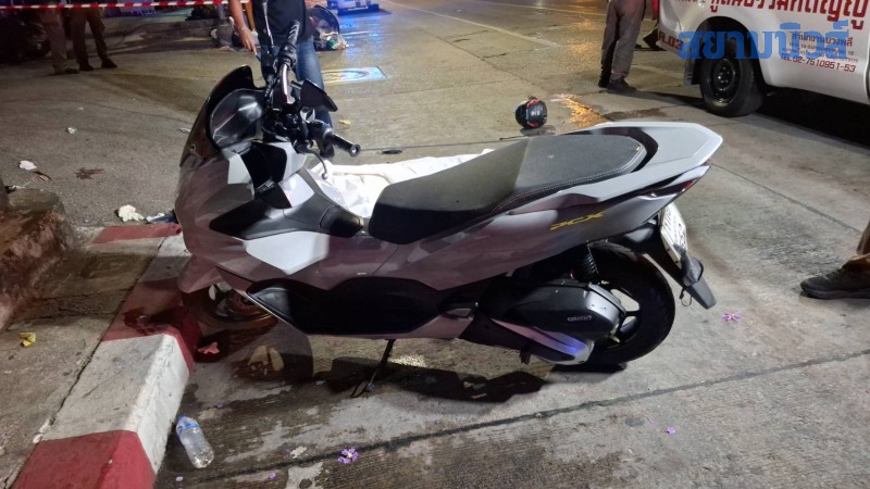 จากการตรวจสอบพื้นที่ พบรถจักรยานยนต์ยี่ห้อฮอนด้า รุ่นพีซีเอ็กซ์ สีเทา หมายเลขทะเบียน 1 กย 8552 สมุทรสาคร ล้มอยู่ในจุดเกิดเหตุ และพบอาวุธมีดจำนวน 2 เล่มตกอยู่ เจ้าหน้าที่จึงเก็บไว้เป็นหลักฐาน