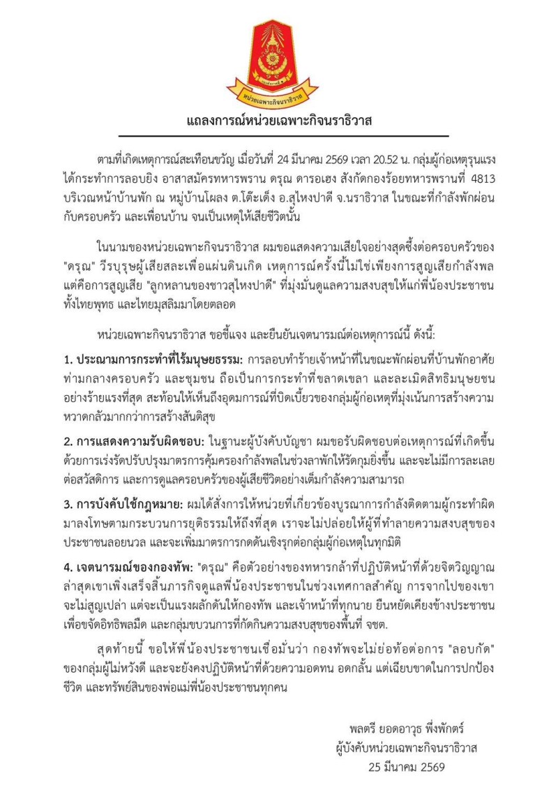 ลงนามเมื่อวันที่ 25 มีนาคม 2569 โดยพลตรี ยอดอาวุธ พึ่งพักตร์ ผู้บังคับหน่วยเฉพาะกิจนราธิวาส