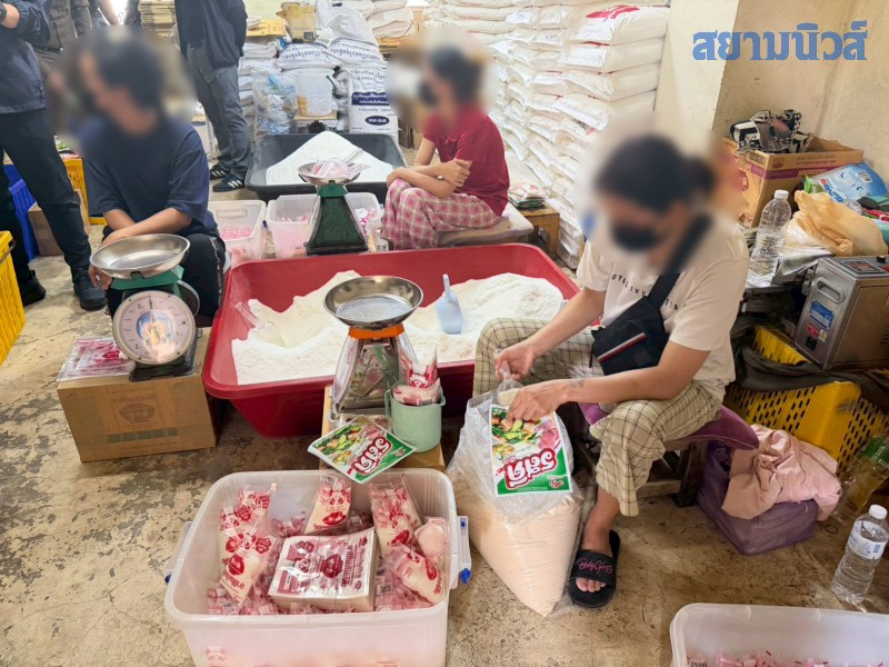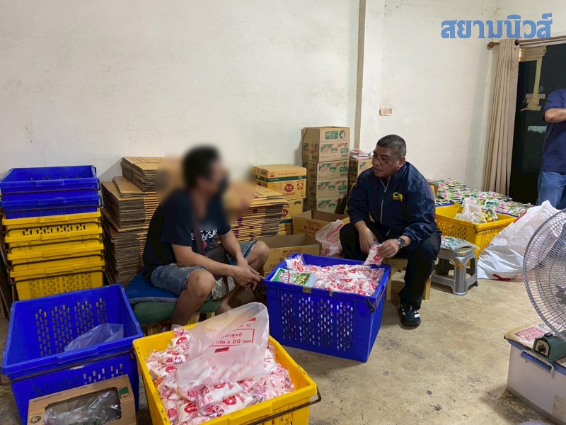 ย่านสะแกงาม 50 (แสมดำ) พบเป็นโรงงานบรรจุหลัก พบนายเกรียงไกร พร้อมพนักงานกำลังนั่งผลิตสินค้าอยู่คาตา