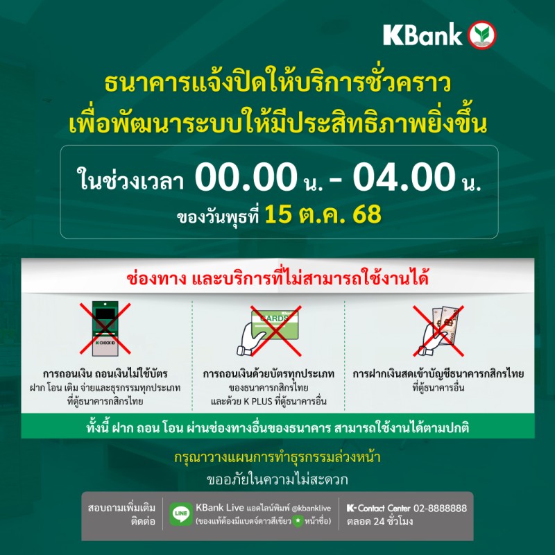 ทั้งนี้ ฝาก ถอน โอน ผ่านช่องทางอื่นของธนาคาร สามารถใช้งานได้ตามปกติ กรุณาวางแผนการทำธุรกรรมล่วงหน้า สอบถามเพิ่มเติมที่ LINE KBank Live แอดไลน์พิมพ์ @kbanklive (ของแท้มีแบดจ์ดาวสีเขียวหน้าชื่อ) หรือ K-Contact Center 02-8888888 ตลอด 24 ชั่วโมง ธนาคารขออภัยในความไม่สะดวก